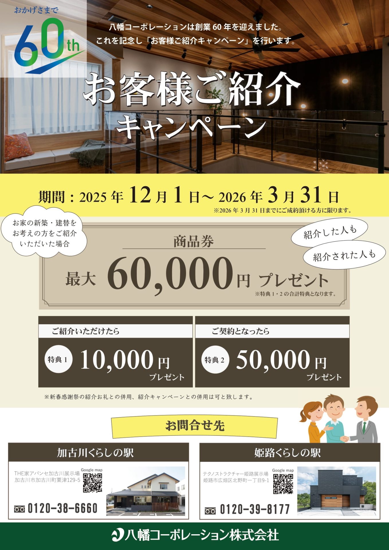 また60周年を記念し、「お客様ご紹介キャンペーン」を行いますので、親戚・知人等で新築、建替をお考えの方がいらっしゃいましたらご紹介を宜しくお願い致します。